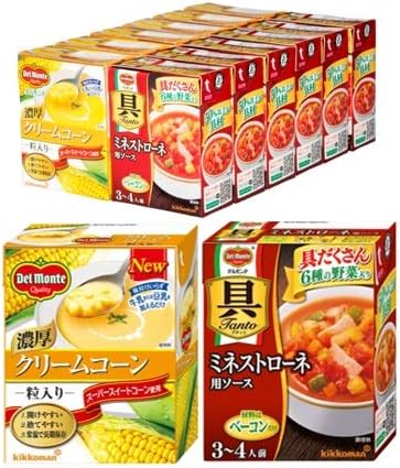 タイムセール特価!ミネストローネとクリームコーンスープの12個アソートセット。『具Tantoミネストローネ用ソース』はトマト・たまねぎ・ピーマン・にんじん・セロリ・にんにくの6種の野菜入り。ベーコンを加えるだけで、3-4人前のスープが完成します。『クリームコーン粒入り』は下味付きなので、牛乳または豆乳を加えるだけで、簡単においしいスープが出来上がります。朝食・昼食・夕食にプラス1品、便利な簡単具だくさんスープ。Amazonプライム会員又は2,000円以上の注文で送料無料。それ以外は送料400円です。