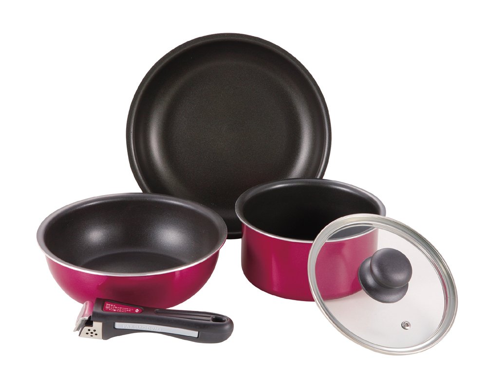 ハンドルが取り外しできる鍋とフライパンのIH対応クックウェア5点セット。ふっ素樹脂塗膜加工。ハンドルを外せばオーブンでの使用も可能。重ねて収納できるので場所を取らない。ガス火はもちろん、200VのIHクッキングヒーターやハロゲンヒーターなどオール熱源に対応。内面はふっ素加工でお手入れ簡単。マルチポットには専用のガラス蓋付。